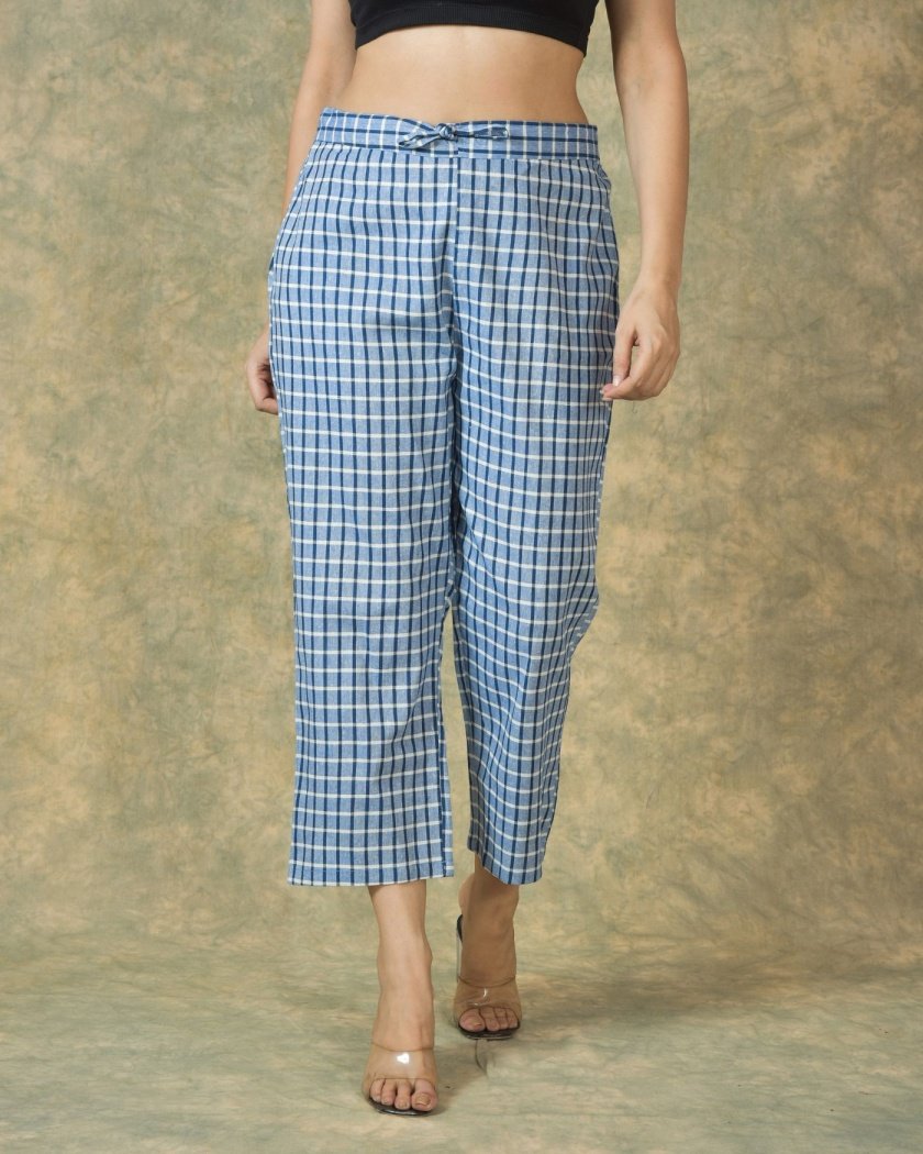 Introducing our stylish Blue-white check cotton pant, designed with a premium cotton fabric for ultimate comfort and durability. These pants offer a perfect blend of style and functionality, making them an ideal choice for any occasion. With their trendy check pattern, they effortlessly enhance your fashion statement. Elevate your wardrobe with these fashionable pants that are both comfortable and chic.