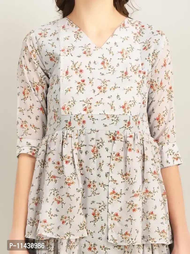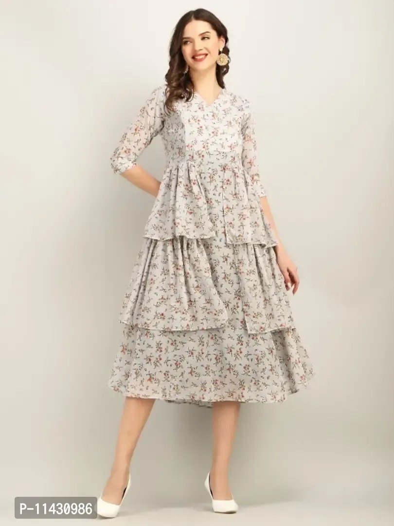 LADY CRAZY Georgette Floral Print V-Neck Long Kurta Long Grey Flare Dress For Women